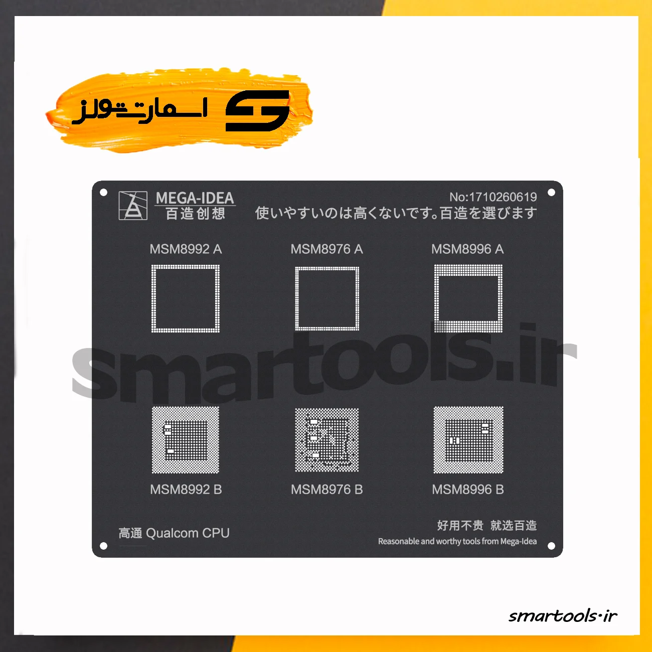 شابلون مشکی MEGA IDEA MSM8992A از فولاد مقاوم و باکیفیت بالا ساخته شده است. ضخامت استاندارد و یکنواخت شابلون باعث می‌شود توپ‌های قلع هم‌اندازه و منظم روی پایه‌های CPU شکل بگیرند.