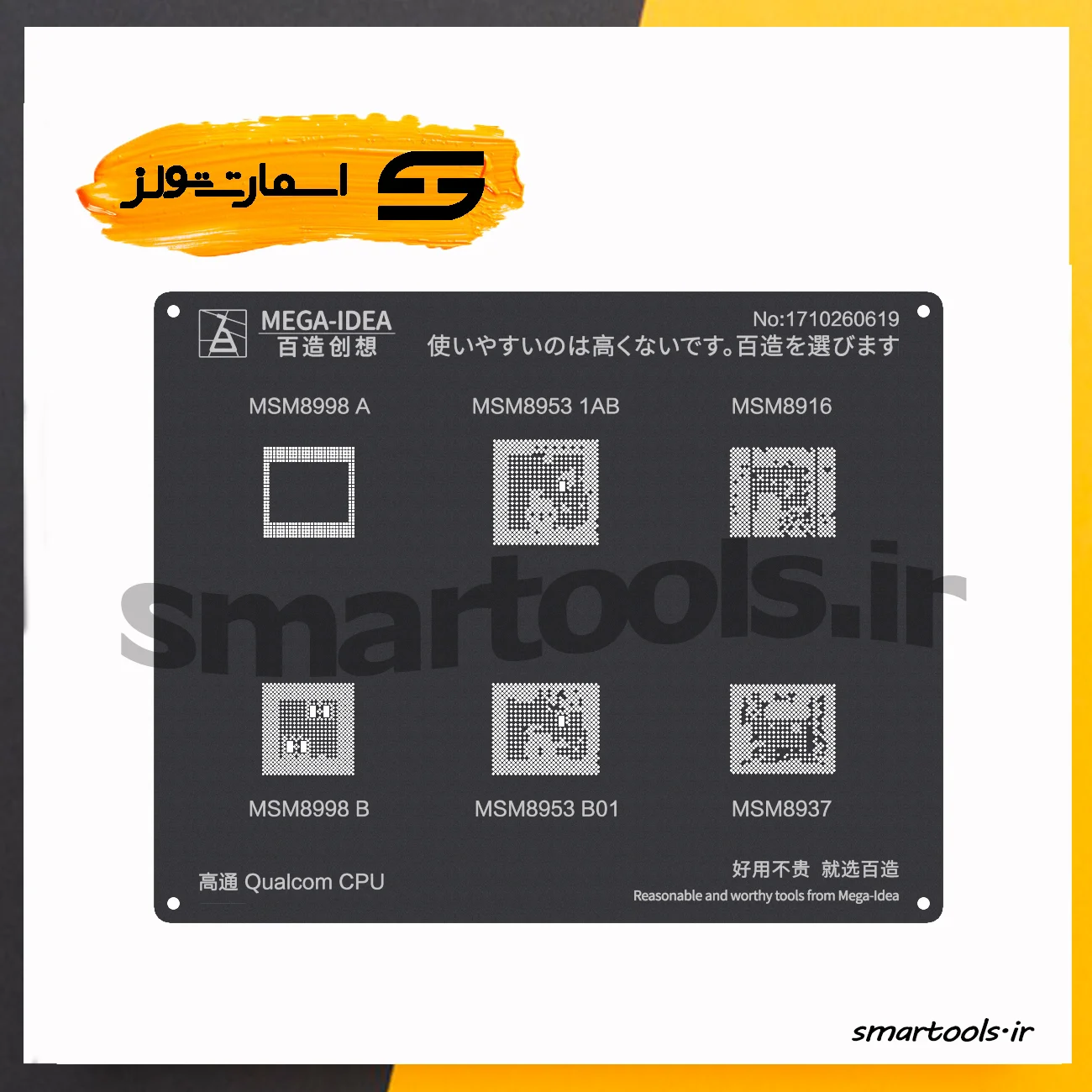 شابلون مشکی مگا آیدیا مدل MSM8998A MEGA IDEA CPU بیشتر برای تعمیرکاران حرفه‌ای و نیمه‌حرفه‌ای طراحی شده است که با آی‌سی‌های CPU و تعمیرات سطح بالا سروکار دارند. استفاده از ابزار استاندارد در این سطح از تعمیرات، نه‌تنها کیفیت کار را افزایش می‌دهد، بلکه از آسیب‌های احتمالی به برد یا آی‌سی جلوگیری می‌کند.